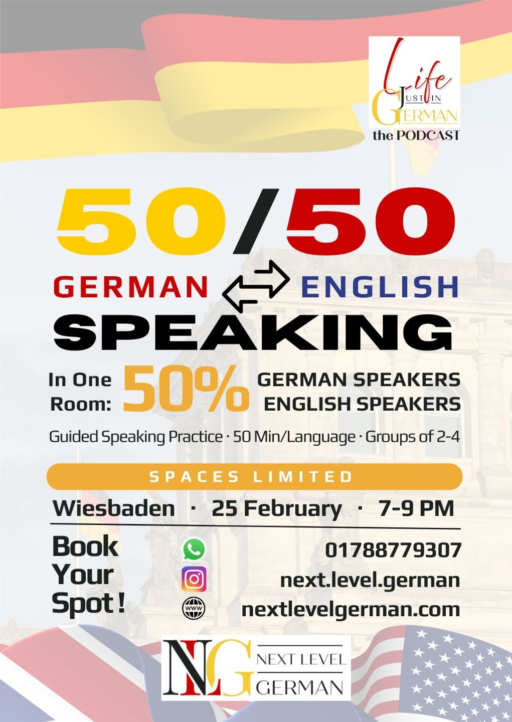 The 50/50 Meet-Up brings together German speakers who want to practice English and English-speaking expats who want to practice German, with time and language split evenly between both groups. The two-hour session includes 50 minutes in English and 50 minutes in German, each combining guided and free conversation, plus a final shared block for group exchange, orientation, and coordination—with relaxed breaks in between. Trained assistants are present throughout, offering quiet, discreet support only when needed, so conversations stay natural and low-pressure. description should go here